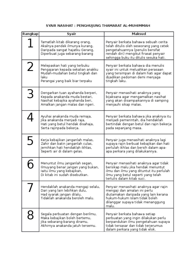Syair ini diambil daripada Antologi Baik Budi Indah Bahasa Tingkatan 2. Easily cancelchange later if needed. Apakah tema syair nasihat penghujung Thamarat Al-Muhimmah.